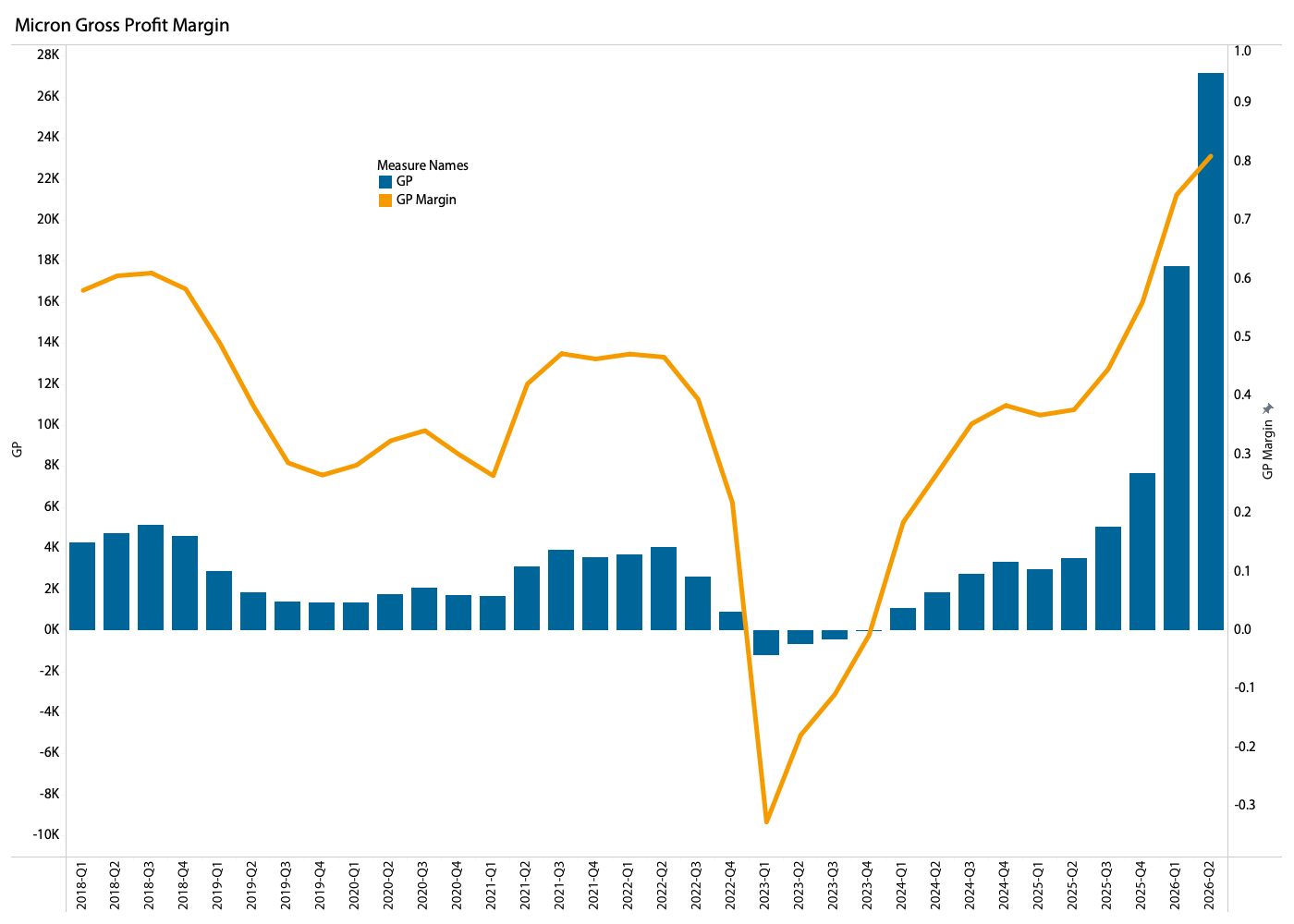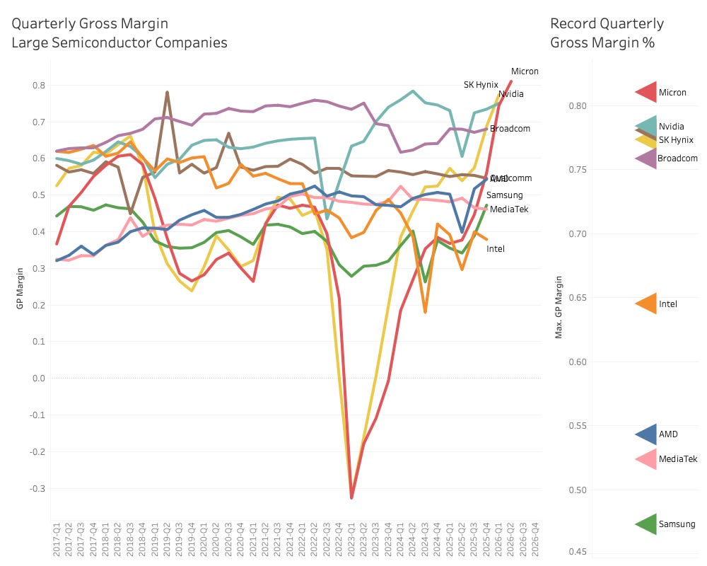 The current record was set in Q2-24 by Nvidia with 78.4% gross margin. In the 4th quarter of 2025, Nvidia was second at 73.4%, behind SK Hynix at 77.3%, already hinting at a structural change. However, if Micron meets its guidance, the company's 81% gross margin will be an all-time high for the semiconductor industry. That is, if SK Hynix does not deliver something even wilder in this quarter, which is plausible.