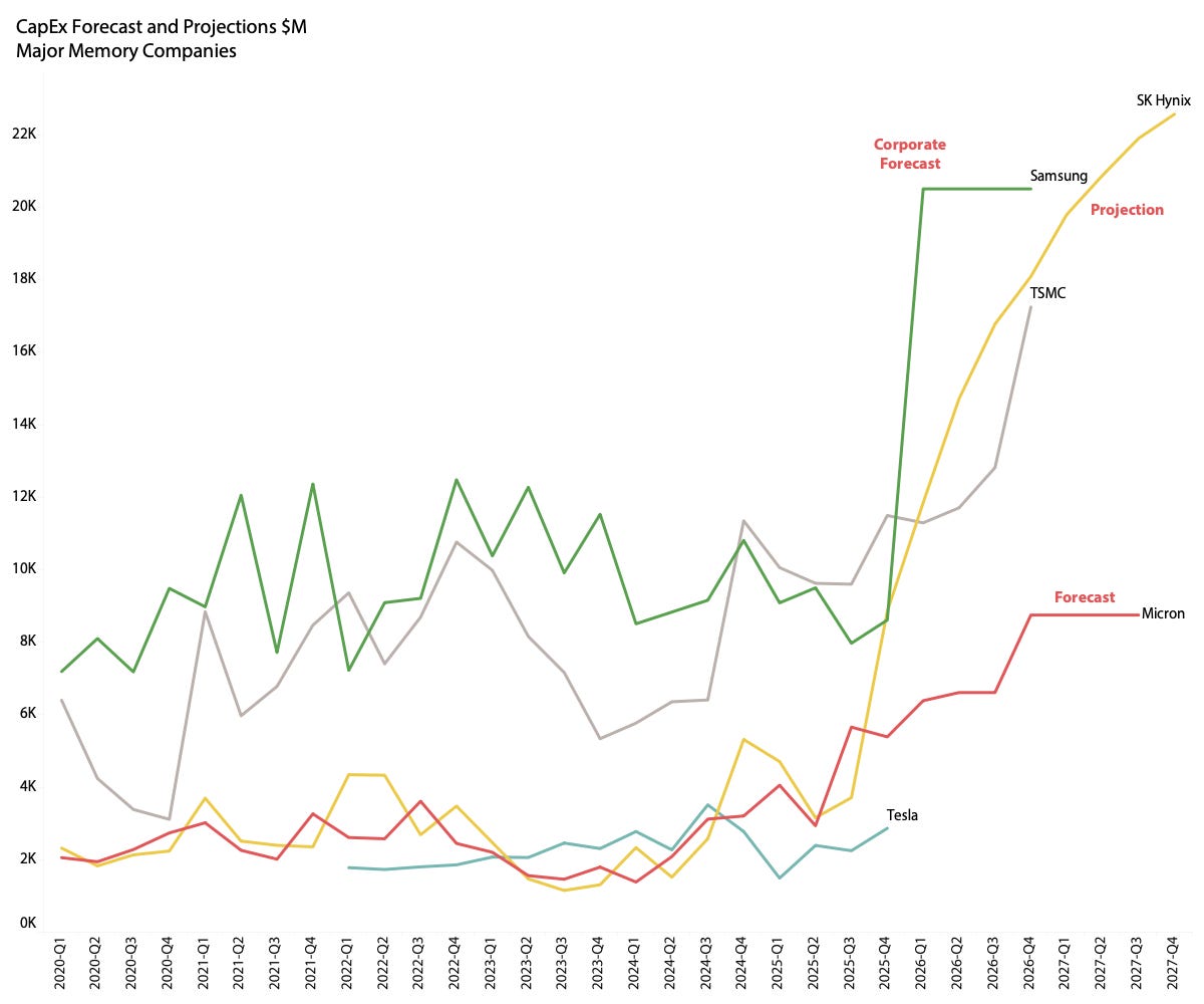 While the CapEx forecast points to a significant increase, most of it will not materially impact 2026 capacity; more likely, it will cause the next downturn (if that is still a thing) 12 to 18 months from now.