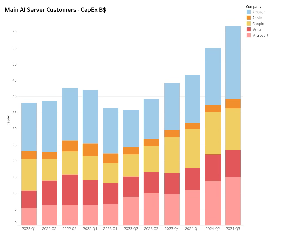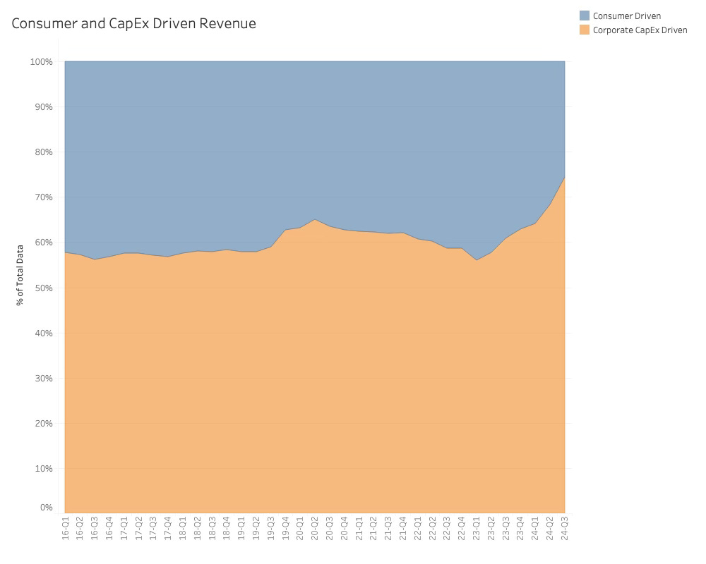 The Semiconductor industry used to be driven by balanced consumer demand and corporate CapEx. However, Corporate CapEx accelerated as the industry entered the cloud era. Since the AI revolution began over a year ago, almost all of the industry's growth has come from CapEx. Thus, we are entering a new phase in the Semiconductor industry.