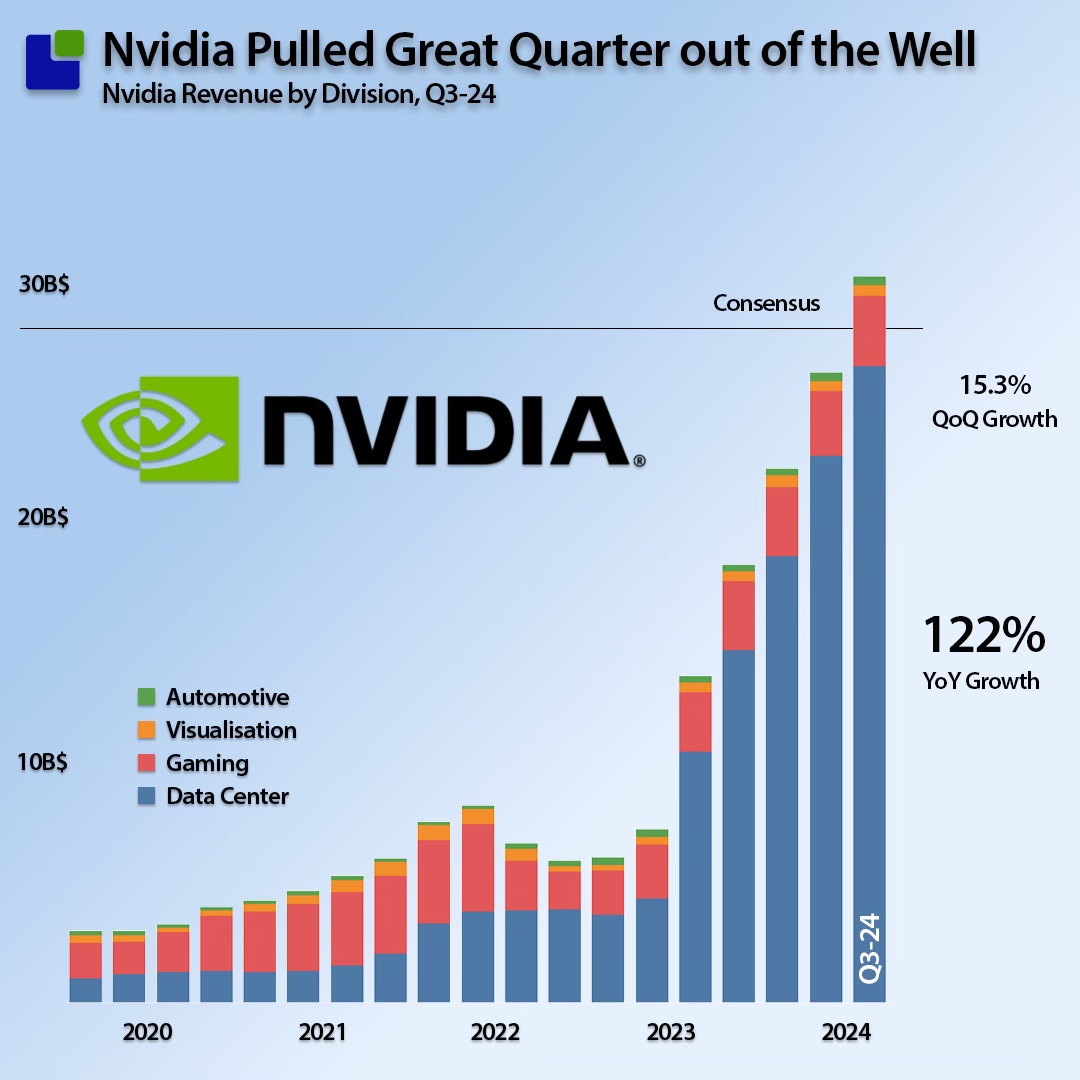 Beating the revenue guidance of $28B with 2B$ to just above 30B$, representing 15% QoQ and a 122% YoY growth. As usual, the increase was driven by the Data Centre business that reached $26.3B, demonstrating that the H100 is not just filling the void before Blackwell takes over, but the H100 demand is still solid.