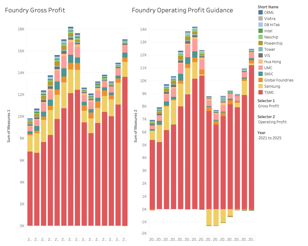 The gross and operating margins reveal that the foundries are not fully recovered except for TSMC. The Taiwanese leader is already much more profitable than the last cycle despite running at a lower capacity than the other foundries. At this point in time, TSMC captures 90% of the operating profits of the Top 14 foundries.
