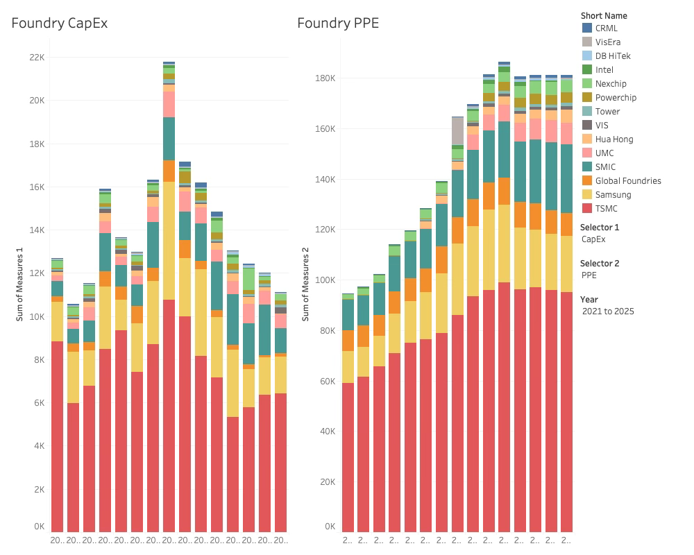 Although property, plant, and equipment are accurate metrics to gain insights into the capacity of a foundry, there is a time skew from an investment being made until you can reap the full benefit of the investment. The advanced analysis will uncover more details about the actual capacity and load levels.