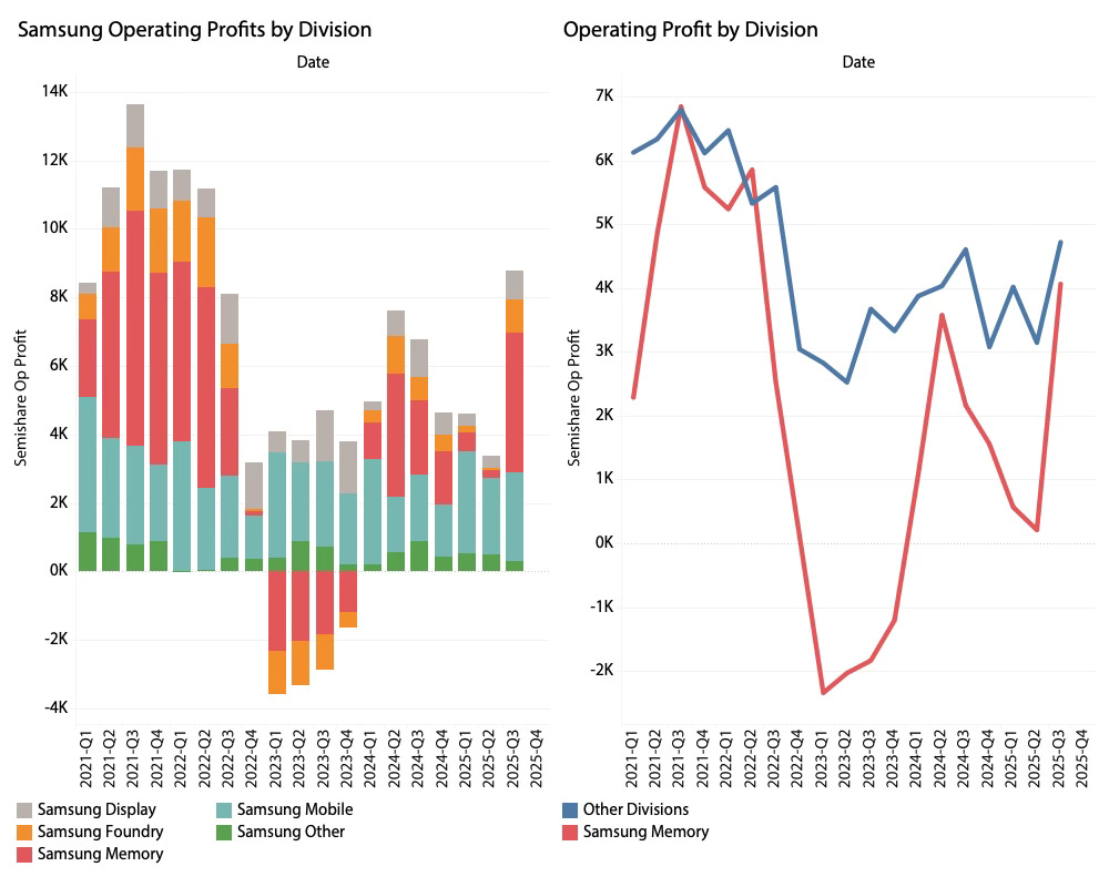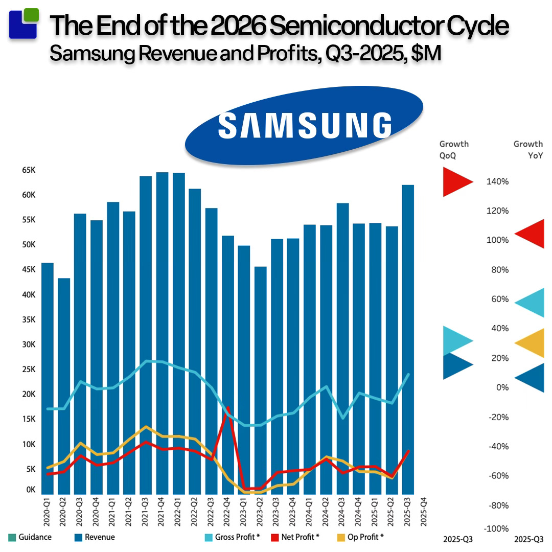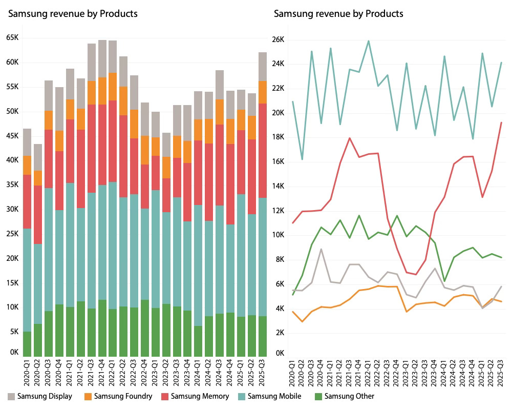 Samsung's significant cyclical trend aligns with memory revenue and, by extension, the broader memory cycle. This is also what is driving the increase in Q3-25 revenue.