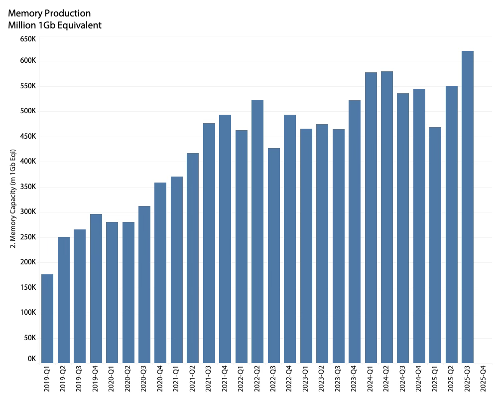 While the memory production of Samsung has been steadily increasing from a GB perspective as the technological development has improved the memory cell size, but like all the other memory companies, the Koreans got scared by the depth of the last cycle and have held back on investments.