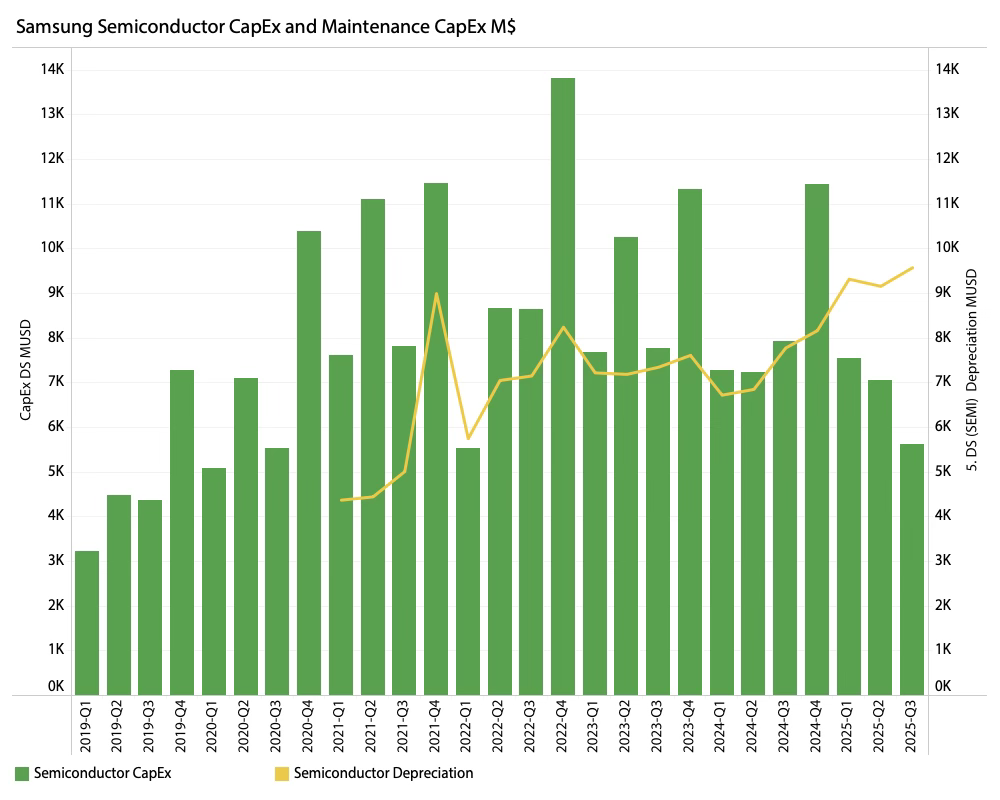 This is confirmed by analysing Semiconductor CapEx relative to the maintenance CapEx required to keep the manufacturing assets at the same level. In the downcycle, the Company balanced investments at about the maintenance level, but over the last three quarters, the investment level has fallen to a very low level. In Q3, Samsung should have invested $9.6B in maintenance before any additional capacity investments, but the Koreans dished out a meagre $5.6B.