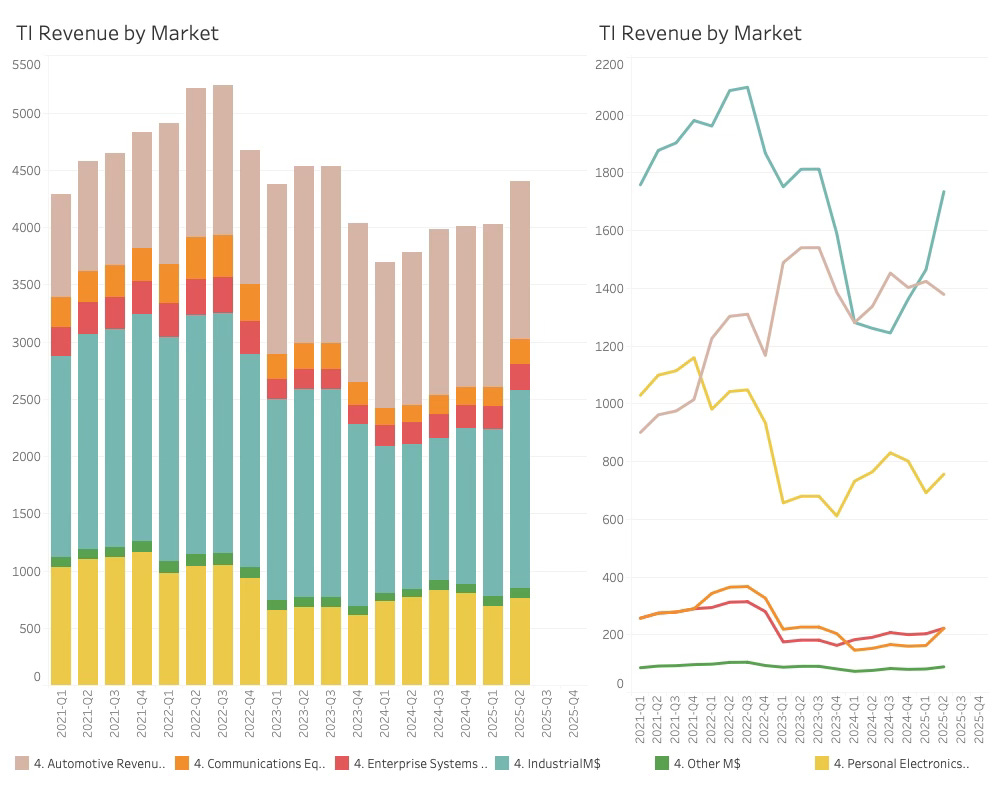 What TI revealed in terms of revenue by market was that industrial and personal were driving the quarter with automotive declining sequentially.