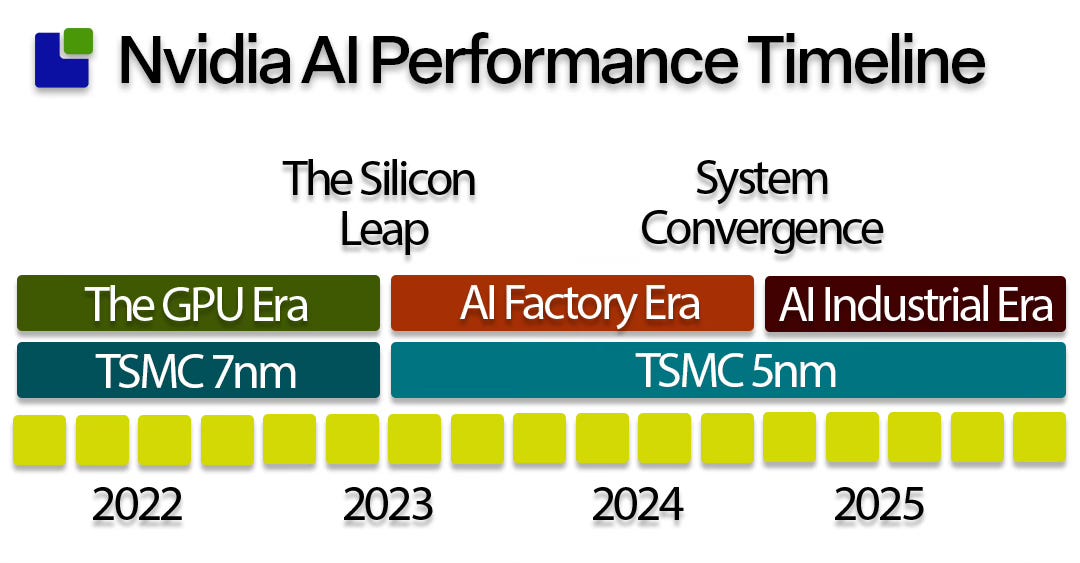 The AI systems era represents a more significant leap than the silicon leap. The AI Factory era is barely visible.
