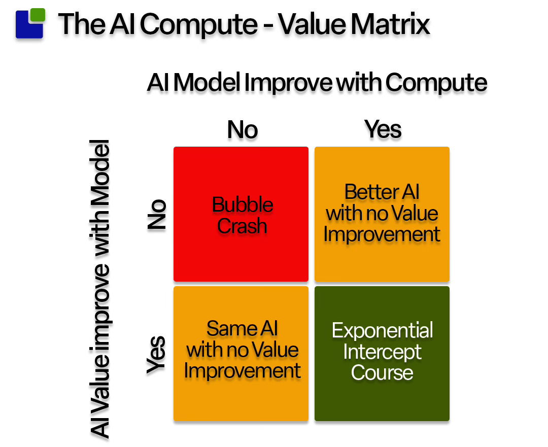 The discussion is framed as an either-or discussion. Either AI provides value or not, and if not, we are in a bubble. A slightly more nuanced perspective would be to break the question into two: Do AI models improve with compute, and does AI value increase with better models?