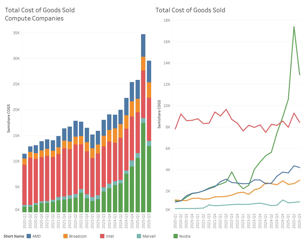 While Nvidia accounts for 73% of Datacenter revenue, it accounts for only 41% of total COGS (ignoring the fluke H20 writedown in Q2-25). This includes all the products sold by the companies, but we can see that the AI unit sales are more comparable to the CPU unit sales, while the revenue favours the AI giant.