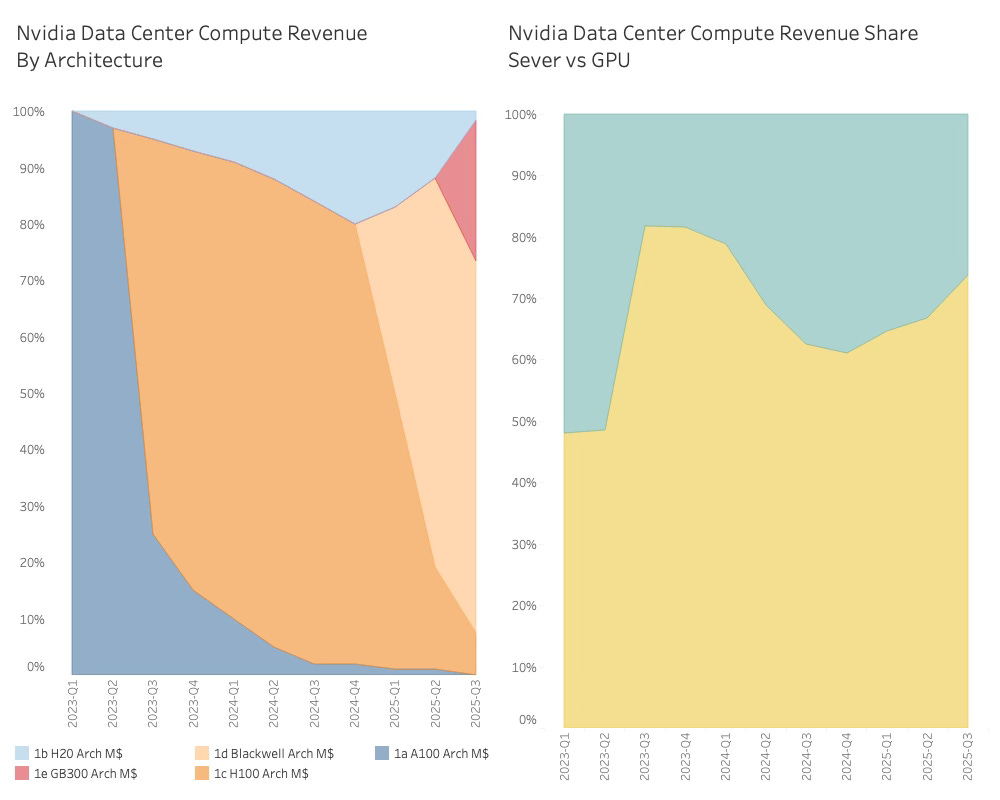 The revenue from rack-scale systems is closing in on 75%, and the rapid succession of architectures is very evident.