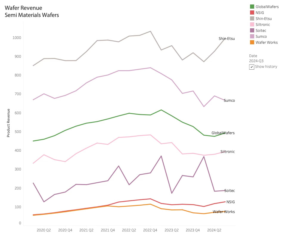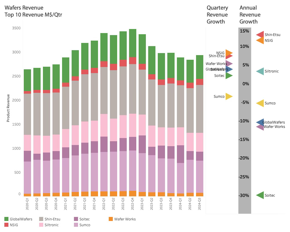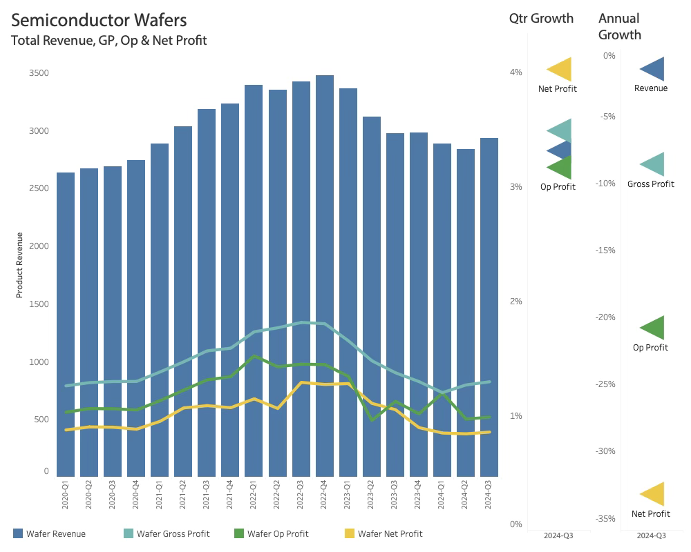 My analysis has now taken me to the Silicon Foundation of the industry: The wafer manufacturers. The people in the Wafer companies sit in front of Bloomberg TV, wondering what is happening. They are watching Nvidia grow over 300% since the WSTS called the upturn 6 quarters ago, and TSMC has grown 50% since then. Despite a slight increase in Q3-24, the Wafer manufacturers have not gained any benefits from the AI boom. Is the cycle delayed, or is it related to lower prices? It is time to take a look at the Wafer Manufacturers.
