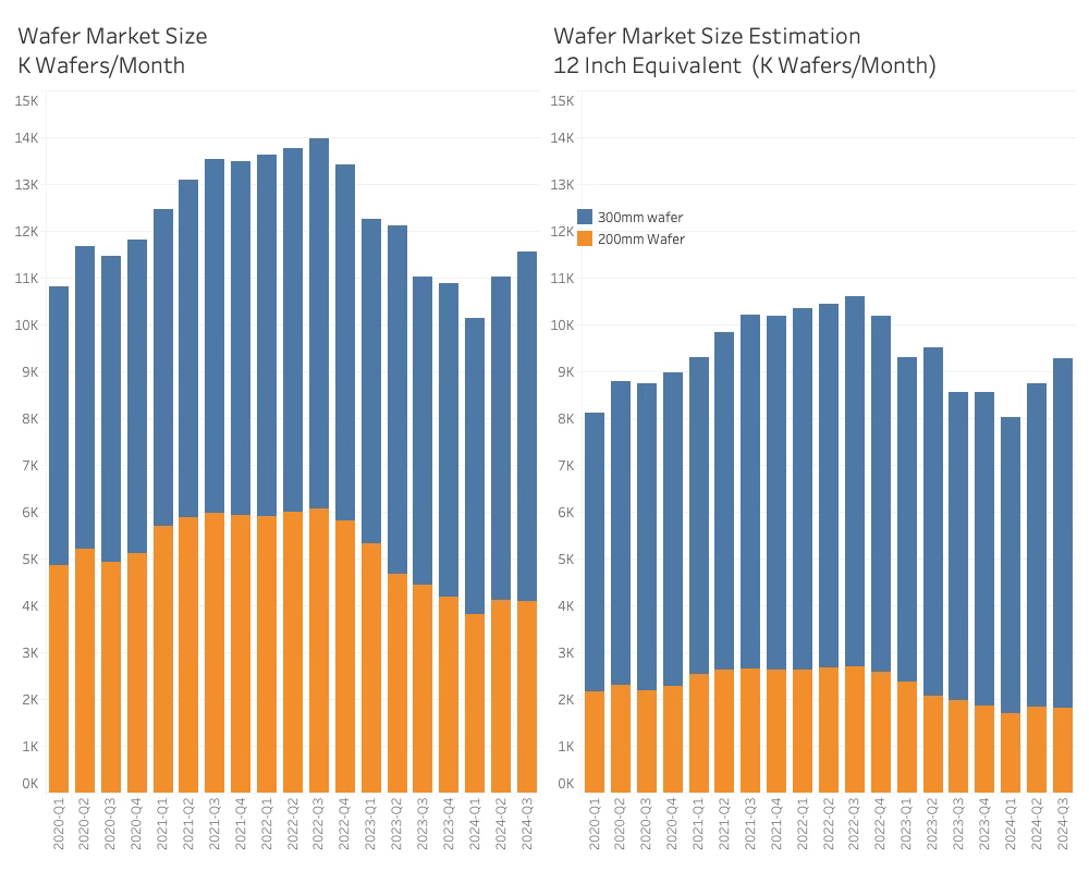 The left graph shows the actual wafers shipped in K Wafers/month, while the right shows the 12 inch equivalent K Wafers/month shipped and is a proxy for the silicon area shipped.