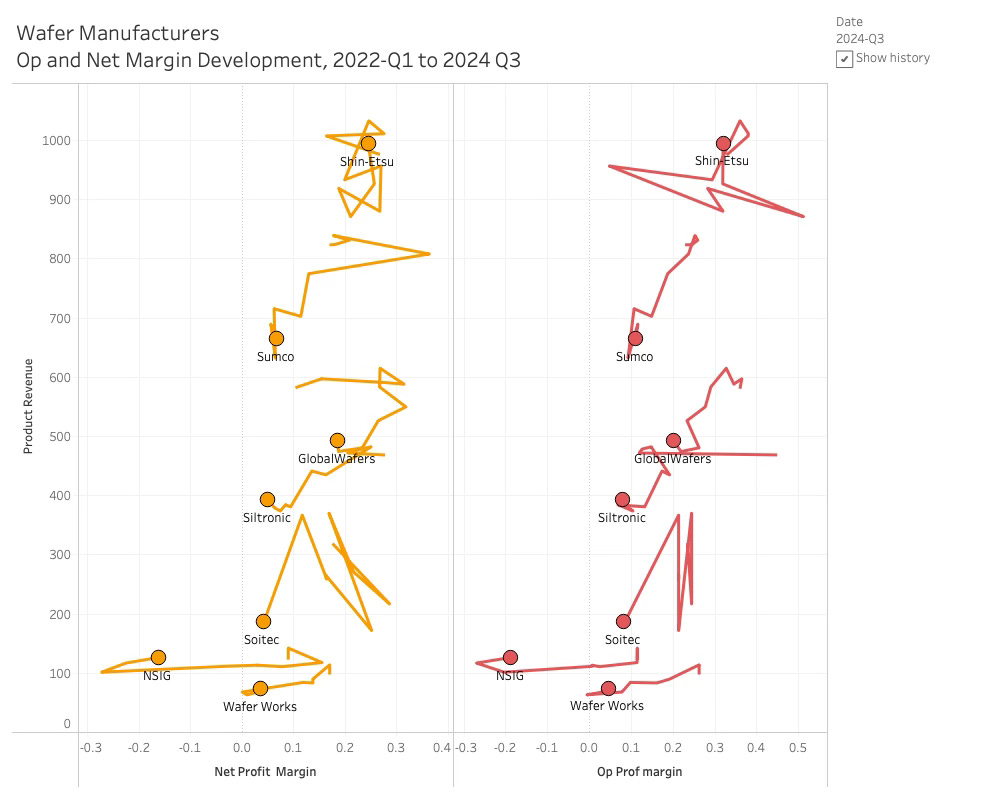 Not surprisingly, NSIG of China has lead the pricecompetitio and basically been selling at a loss for the last year hunting marketshare. The other wafer manufactureres have had to follow the dragon and have mostly followed the prices down although not to the same extrem level. Shin-Etsu has floated a bit around but is basically back to where it began in the beginning of 2022.
